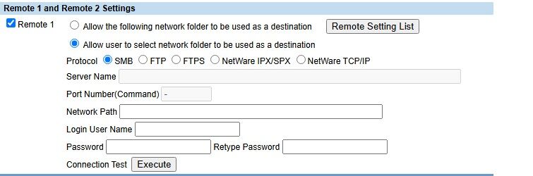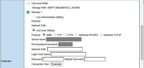 24. Scroll down to Destination and choose Use Network Folder Destination. Change the Default file path to Remote 1. Scroll down and click the box next to Remote 1 in Remote 1 and 2 Settings. Select Allow user to select network folder to be used and change the protocol to SMB. Click Save.