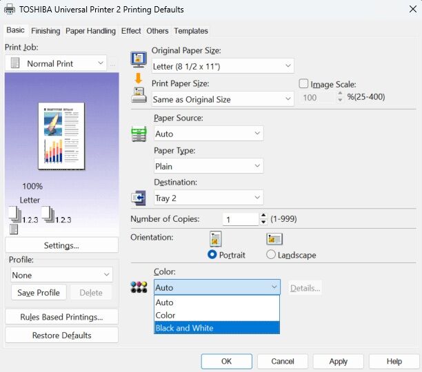 5. On the Basic tab choose the drop down for Color and change it to Black and White if you would like your prints to print out as Black unless Color is specifically chosen. Click Apply.