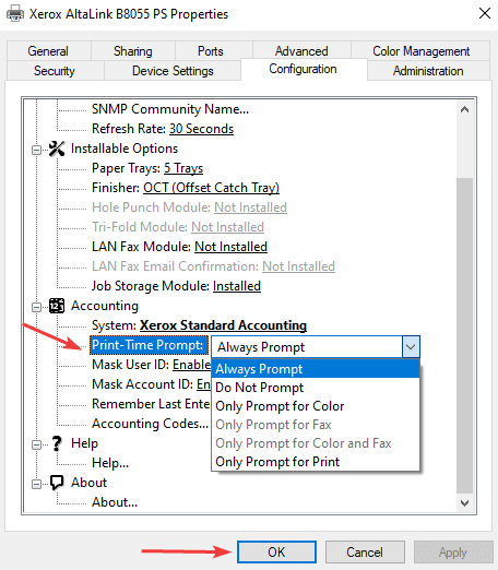 6. For the Print-Time Prompt”, select if you always want a pop-up box or only for color, or not at all. If you choose “Do Not Prompt”, you will need to input the “User ID”, select “Default” for the “Account type” and then click “OK”.