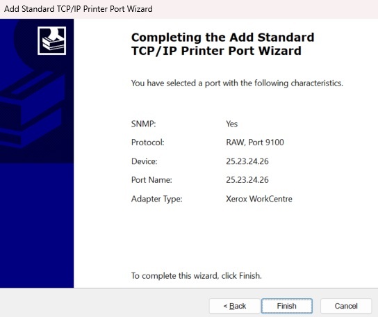 6. Click Next. In the Printer name or IP address type in the newly acquired IP address of your machine and click Next. Continue through the wizard until you can choose Finish.