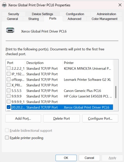 7. It will go back to the Printer ports box. Click Close then Click Apply in the lower right corner. The printer will be pointed to the new IP address.