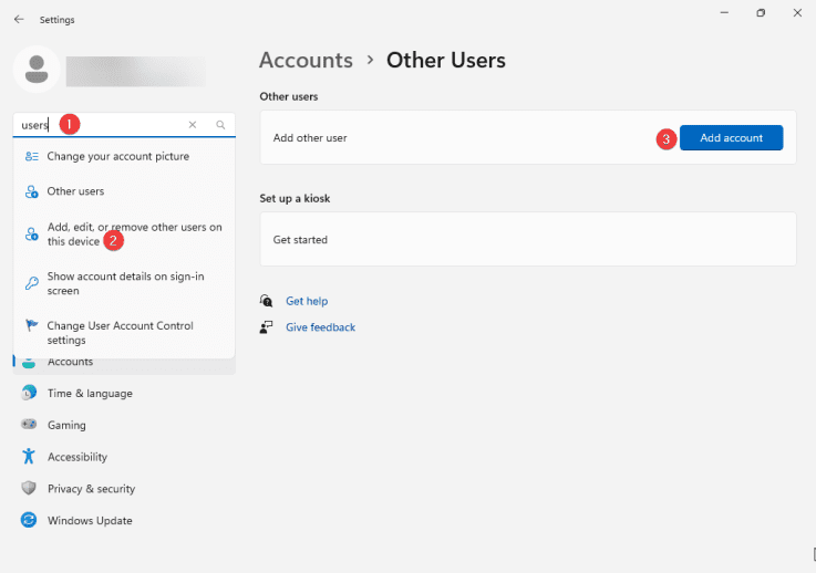 2. Type “users” into the search bar and select “Add, edit or remove” and then on the right select “Add account”.
