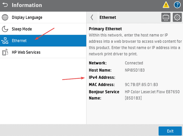 1. Go to the physical copier and press the blue “i” icon at the top of the screen, then press “Ethernet”, find the “IP Address” and write it down.