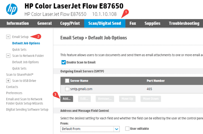 3. Click the “Scan/Digital Send” tab at the top and then, in the left column, click the “Email Setup” option and click “Add” under “Outgoing Email Servers”.