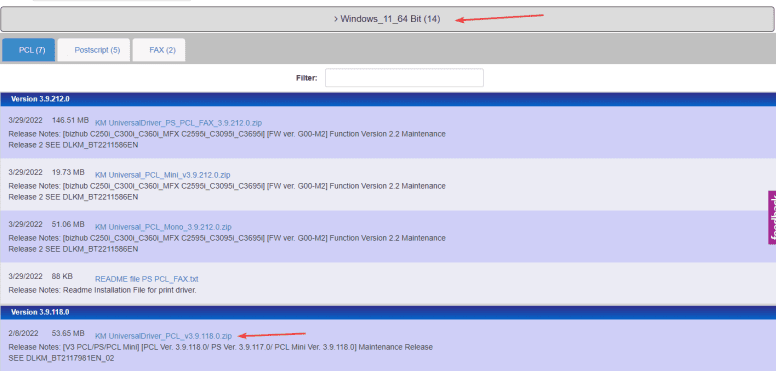 4. Expand the “Windows_11_64_Bit” section, find and download the “KM_UniversalDriver_PCL_v3.x.xxx.x.zip”. The version number will update with changes so just find the one that starts with v3.