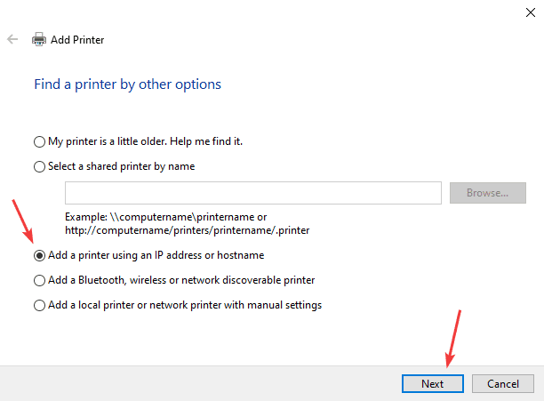 12. Select “Add a printer using an IP address or hostname” and then click “Next”.