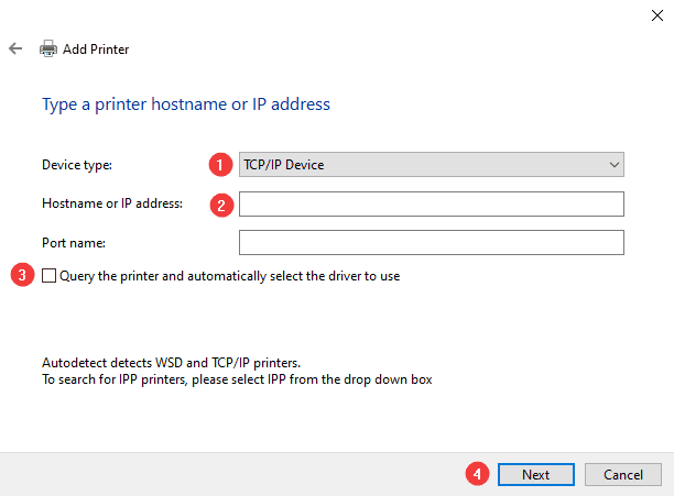 13. Drop down the “Device type” to “TCP/IP Device”. Type the IP address of the copier in the “Hostname or IP address” field. Leave the “Port name” field with whatever is populated there, uncheck the box at the bottom, then click “Next”.