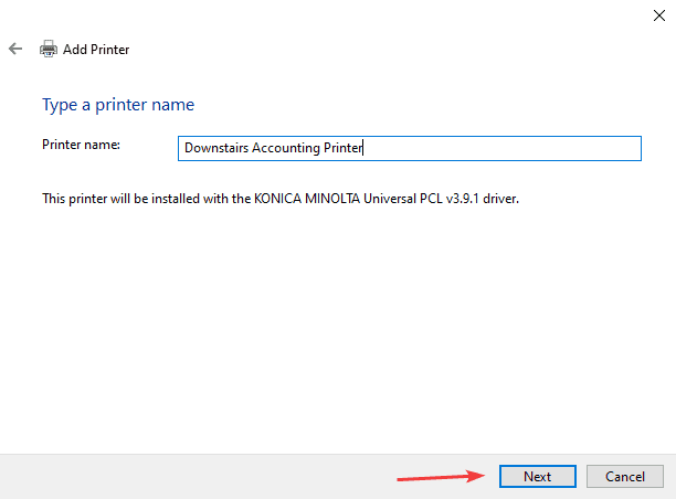 19. Name the printer and then click “Next”. It is best to give it a unique name so you can recognize it from the list if you have more than one of the same model.