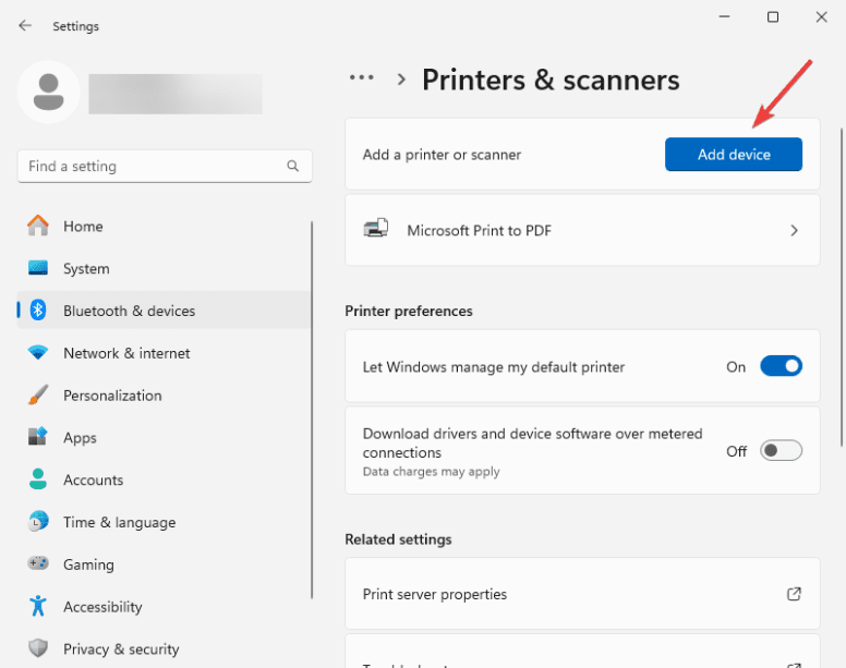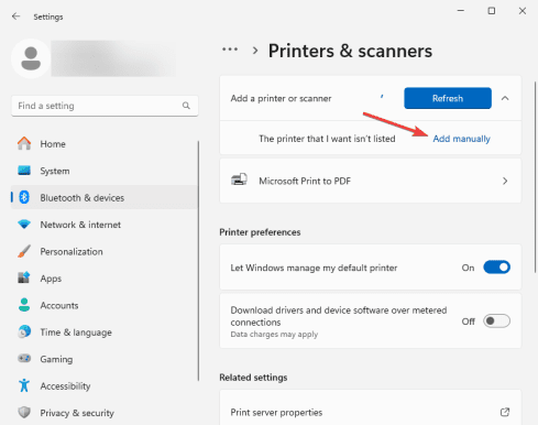 10. Select “Bluetooth & devices” from the left menu and then “Printers & Scanners”.