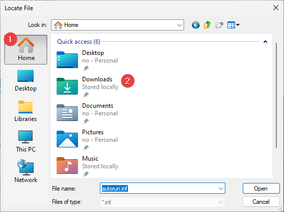 16. Select the “Home” tab on the left and then select “Downloads”. Find the folder you extracted earlier and open it in the order shown below until you get to the .INF file and then open it.