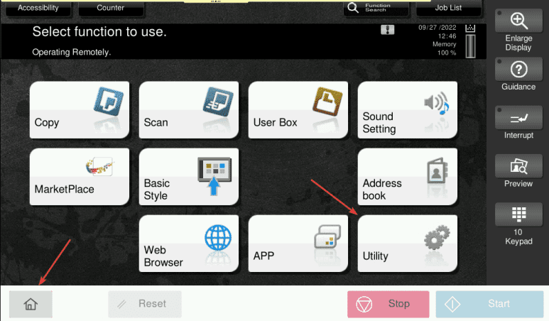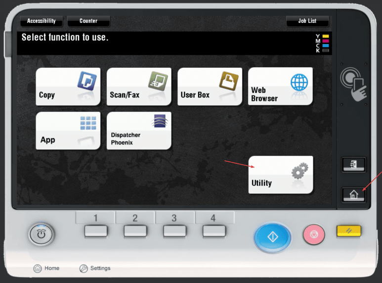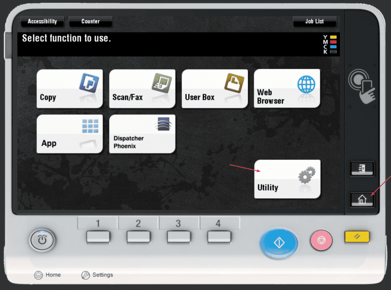 1. At the copier, press the “Home/Menu” button and then press the “Utility” option on the screen.