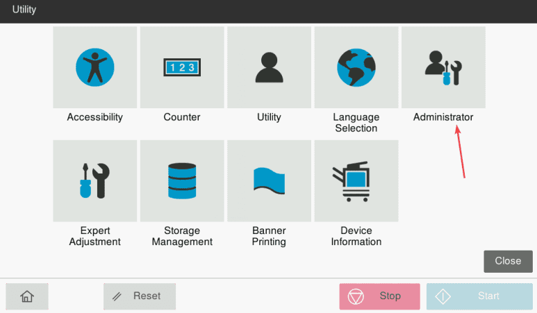 2. Press the “Administrator” or “Administrator Settings” option, input the password and then press “OK”.