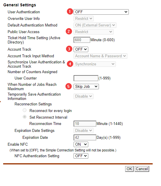 6b. If you want public users to have access to the copier, you can choose “on with login” or “restrict” to prevent anyone without a username/password from having access.