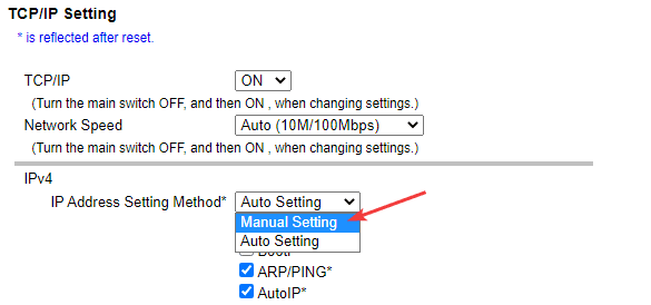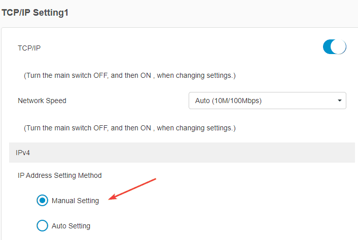 9. Find the drop-down or the bubble selection that shows “Auto Setting”, switch it to “Manual Setting” and then click “OK” to finalize the settings. After you have set the IP address to be permanent, you can log out of the webpage.