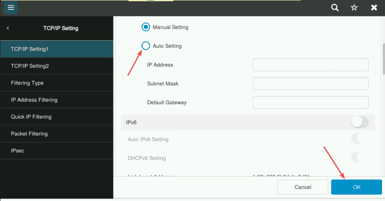 3a. “Network” > “TCP/IP” > “TCP/IP Setting 1”. Under the IPv4 section, choose the “Auto Setting” bubble, then hit “OK”. You should get a message that the ” network data is being processed”. Once that goes away, follow the next step.