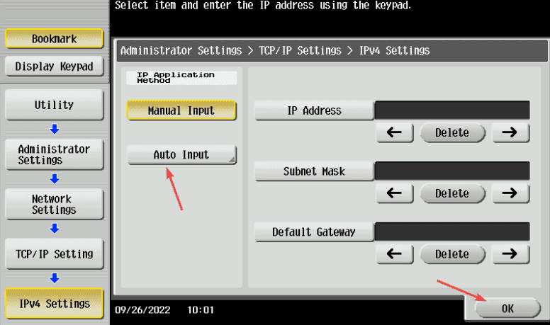 3b. “Network” > “TCP/IP” > “IPv4”. Select “Auto Input” and hit “OK”. You should get a message that the ” network data is being processed”. Once that goes away, follow the next step.
