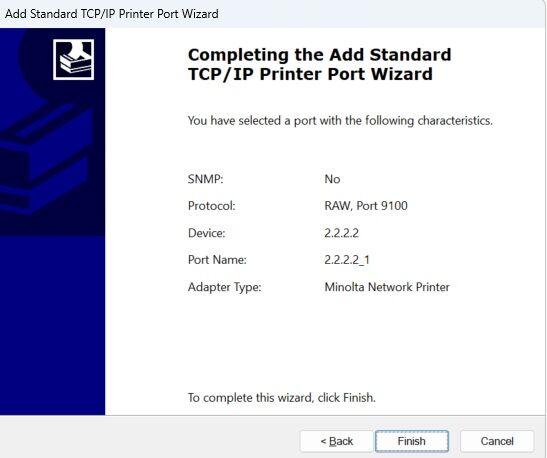 13. Click Next and enter the newly acquired IP address from the MFP. Click Next and continue through the Wizard until you have the option to click Finish.