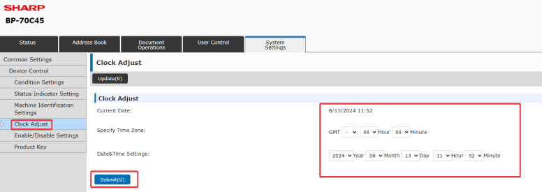 6. On the left side select “Clock Adjust”, change the time to the correct setting and then select “Submit”.